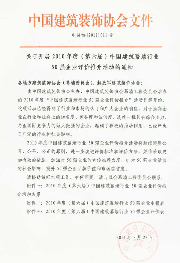 2010年度(第六屆)中國(guó)建筑幕墻行業(yè)50強(qiáng)企業(yè)評(píng)價(jià)推介活動(dòng)的通知