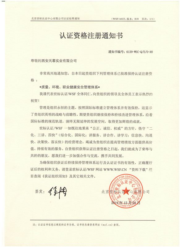而就在這天,我公司收到北京世標認證中心寄來的快件,宛如陽光,溫暖著天幕人。而快件的內(nèi)容更像是古時候軍隊傳來的捷報,振奮人心——我公司成功取得“質(zhì)量、環(huán)境、職業(yè)健康安全管理體系”認證注冊資格。