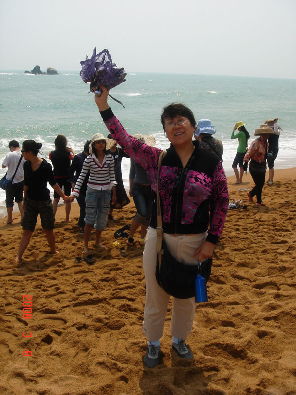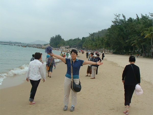 接下來的幾天我們在導游的帶領下,游覽了分界洲、瓊海、大東海、亞龍灣、萬泉河、五指山和天涯海角等風景區(qū),海南景色優(yōu)美,環(huán)境清新,游人也很文明,生怕玷污了自己內心的凈土,尤其是在“天涯海角”,那里聚集了很多游客,有親密的情侶、有攜手的老伴、有相擁的中年人、有提鞋嬉戲的孩童。人們在此處留影,光腳到沙灘上行走,海水拍打著腳面,暖暖的,軟軟的,麻酥酥的,沁人心脾。從腳到全身的每個細胞都游離在舒適、輕松、溫暖和諧的感覺中,近看,有一對年輕人漫步跑入海灘,追逐著海浪,海浪突然急轉身想擁抱他們,他們急速回跑,但仍然被澆個梨花帶雨。向遠處看,海水很靜,很藍,就象熟睡中的寶貝,沒有咆哮,沒有狂燥,偶爾吹來的海風,好象大海傾訴的心聲。