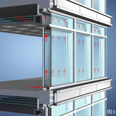 雙層玻璃幕墻(圖3)又稱熱通道幕墻、呼吸式幕墻、 通風(fēng)式幕墻、節(jié)能幕墻等。由內(nèi)外兩層立面構(gòu)造組成,形成一個室內(nèi)外之間的空氣緩沖層。外層可由明框、隱框或點支式幕墻構(gòu)成。內(nèi)層可由明框、隱框幕墻、或具有開啟扇和檢修通道的門窗組成。也可以在一個獨立支承結(jié)構(gòu)的兩側(cè)設(shè)置玻璃面層,形成空間距離較小的雙層立面構(gòu)造。一般分為外循環(huán)式雙層幕墻及內(nèi)循環(huán)式雙層幕墻。內(nèi)循環(huán)式雙層幕墻外層幕墻采用中空玻璃、隔熱型材形成封閉狀態(tài),換氣在幕墻的兩層空間內(nèi)進行,通常需要集中強制通風(fēng)系統(tǒng)的配合才能進行與自然界的交換,達到最終效果。內(nèi)層幕墻采用單層玻璃或單層鋁合金門窗,形成可開啟狀態(tài)。具有保溫、隔熱、夜間通風(fēng)降溫、通透性高、有效保護內(nèi)部構(gòu)建、自然通風(fēng)、節(jié)能、等優(yōu)點,且可做防火通道使用。