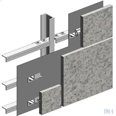 干掛石材幕墻(圖4;圖4-2)是以金屬掛件將飾面石材直接吊掛于墻面或空掛于鋼架之上,不需再灌漿粘貼。其原理是在主體結(jié)構(gòu)上設(shè)主要受力點,通過金屬掛件將石材固定在建筑物上,形成石材裝飾幕墻,其優(yōu)點是天然材質(zhì)、高貴典雅,具有很強的.耐凍性和抗壓強度。
