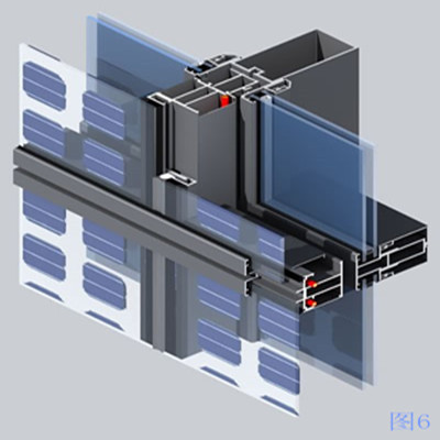 光伏幕墻(圖6)是將太陽能發(fā)電(光伏)產(chǎn)品集成到建筑上,又稱光電幕墻,其原理是利用光電池、光電板技術(shù),把太陽光轉(zhuǎn)化為電能,是一種高科技產(chǎn)品,集發(fā)電、隔音、隔熱、安全、裝飾功能于一身的新幕墻。